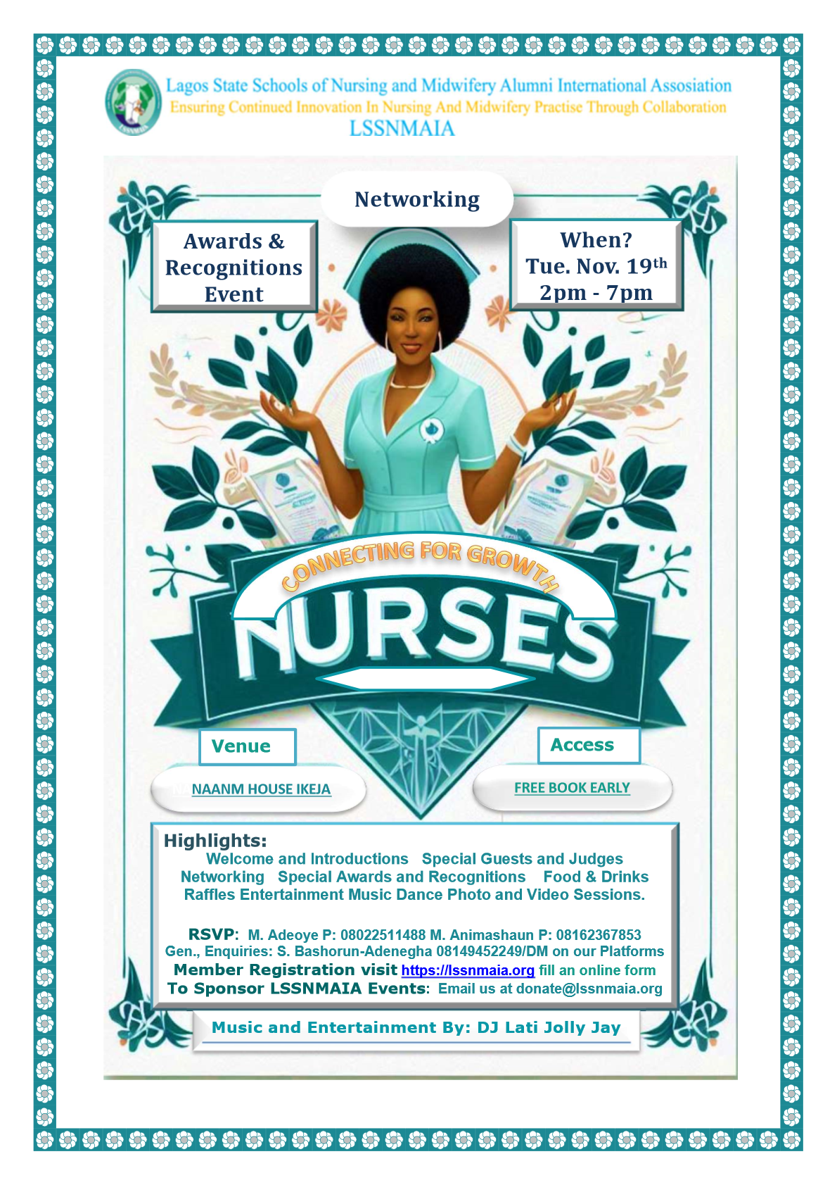 This is a special networking and social event, is for all nurses, active or retired, in Lagos State.  We shall be presenting awards to winners in recognition of good practice, we shall be showcasing some great nurses, promoting well-being, and connecting, ultimately strengthening relations and boosting nursing retention in Lagos State.